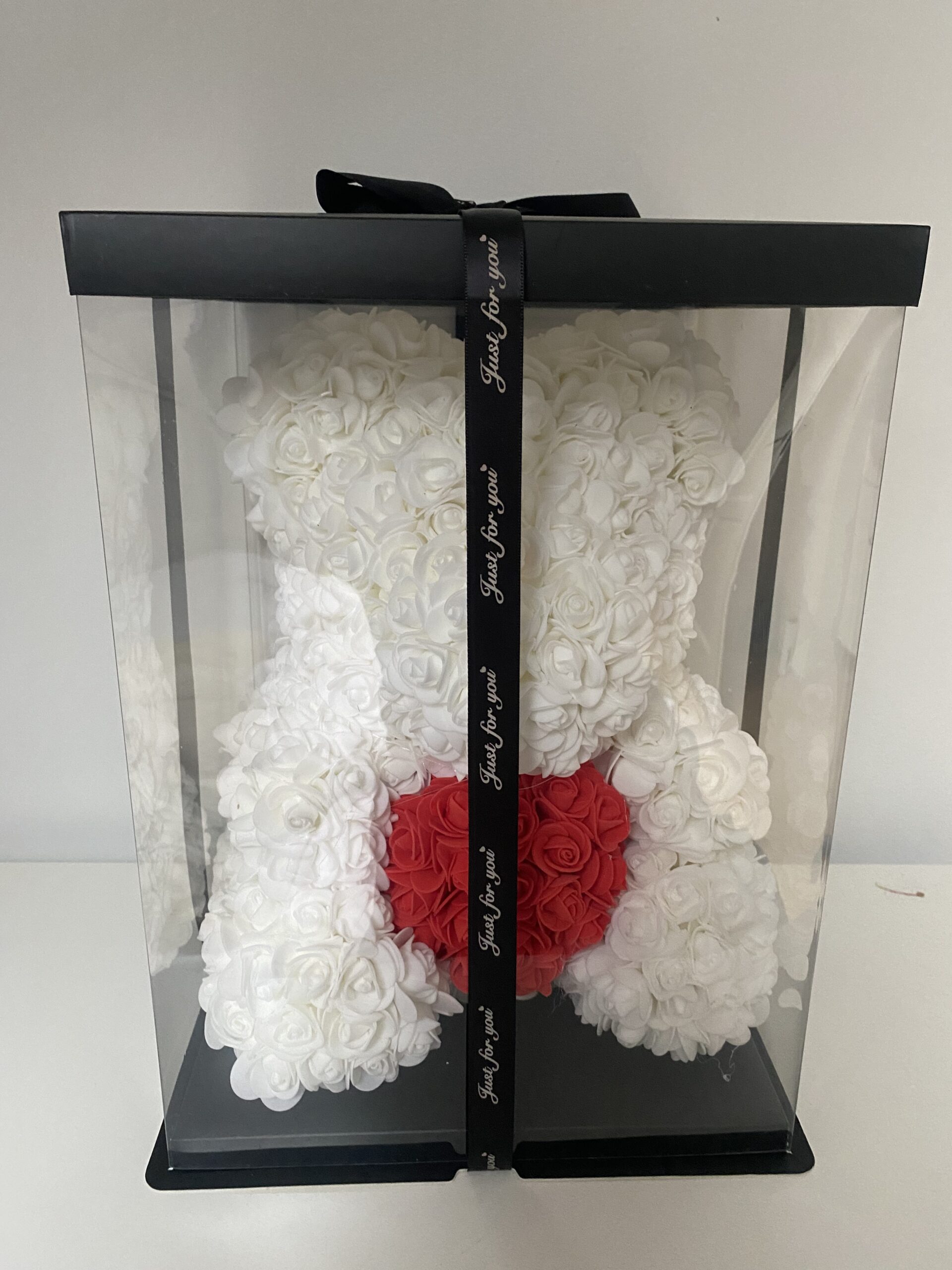 Prachtige rozen beer, super leuk als cadeau decoratie enz… De beren zijn handgemaakt en daardoor super goede kwaliteit en heel exclusief.